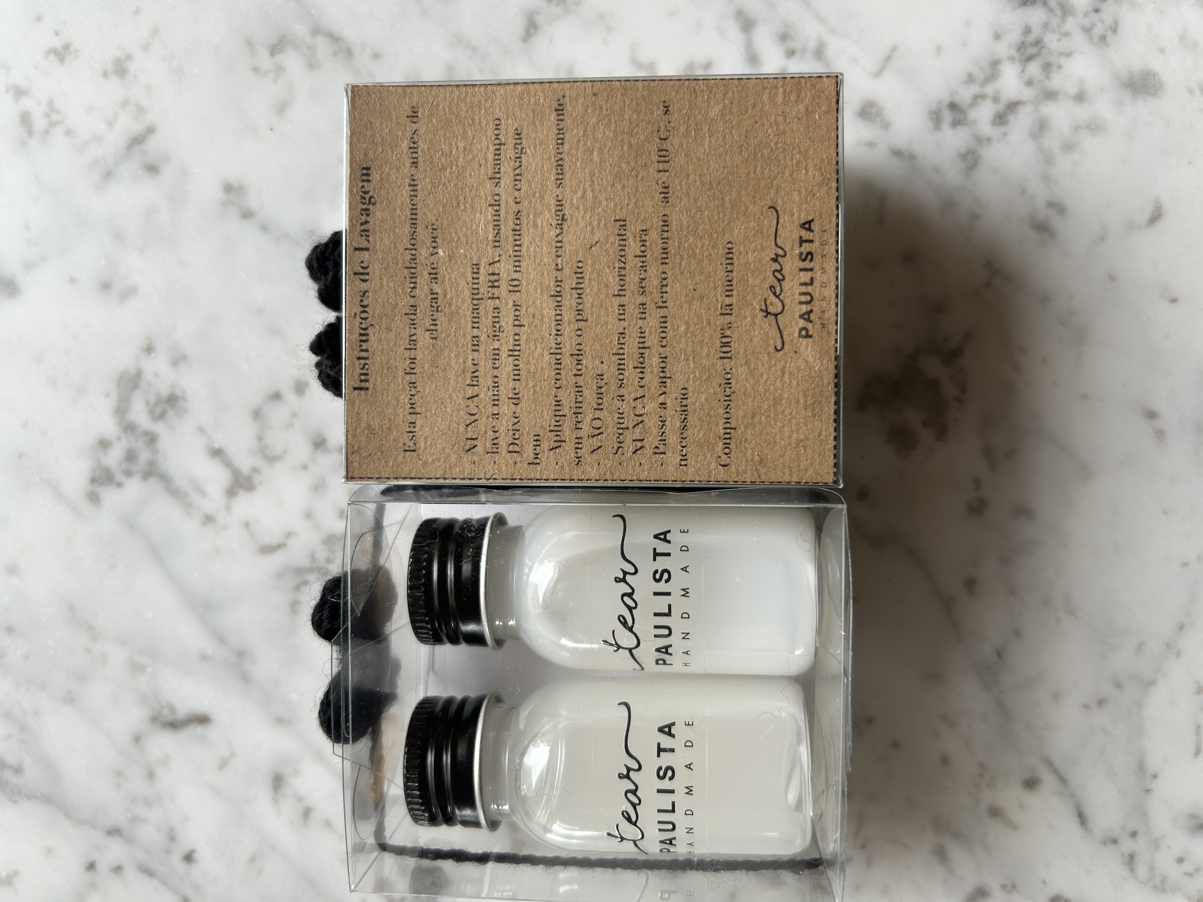 Como parte desse cuidado, toda compra do Tear Paulista acompanha um kit exclusivo de lavagem, com shampoo e condicionador próprios para lã.